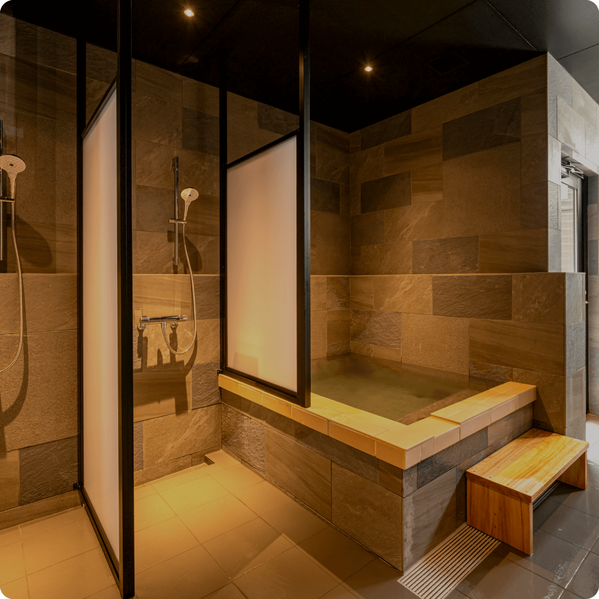 85〜95℃のサウナ室は段ごとに温度調整可能。9~15℃以下の水風呂で鋭く澄んだ冷たさを体感。外気浴スペースと源泉かけ流し温泉で、心も体もととのう。